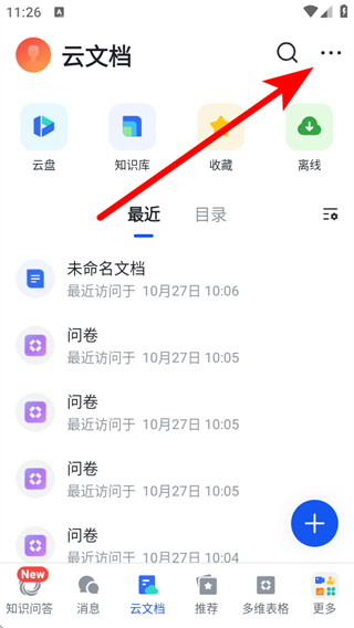2、在云文档页面,点击右上角的…更多,弹出更多选项列表。