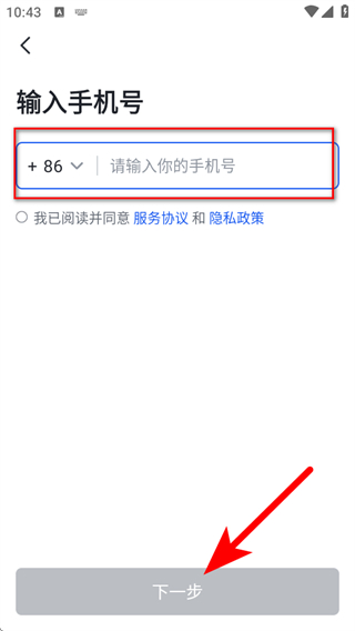 4、输入目标手机号,勾选协议点击下一步,推进登录流程。