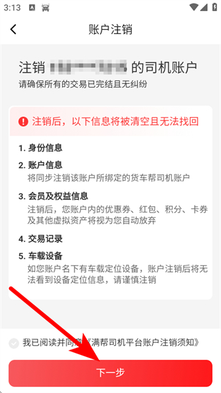 3、在账户注销说明的页面,需要点击下一步,进入注销原因选择页面。