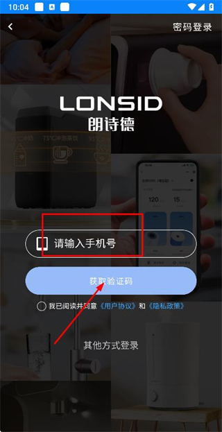2、在登录页面填写手机号,勾选协议后,点击获取验证码。