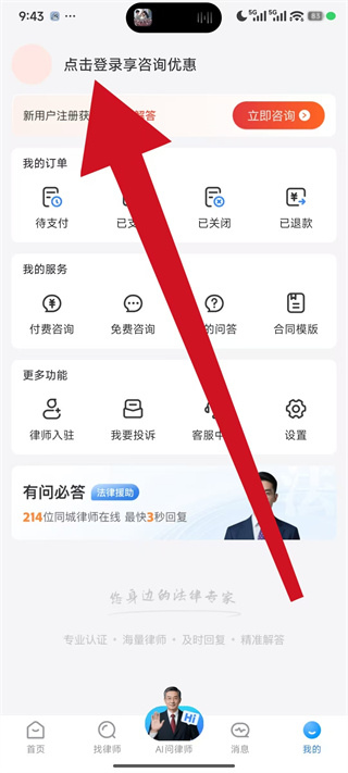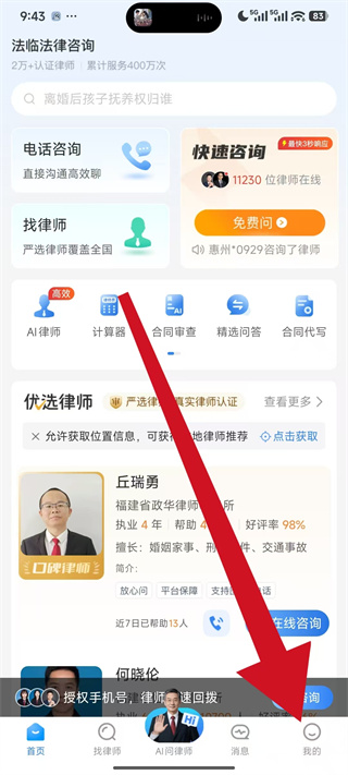 1、打开法临法律咨询,在首页底部导航栏点击我的,进入个人中心页面。