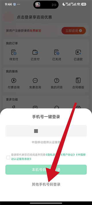 3、在登录选项弹窗中,点击其他手机号码登录,进入验证码登录页面。