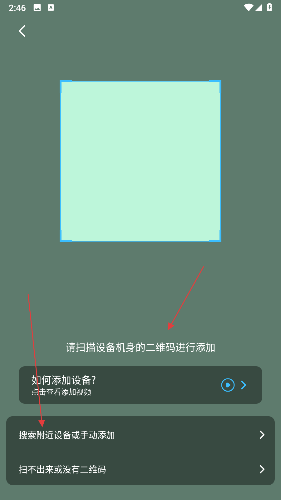 2、进入扫码界面后,可直接扫描设备机身的二维码添加,其他方式点击搜索附近设备或手动添加。