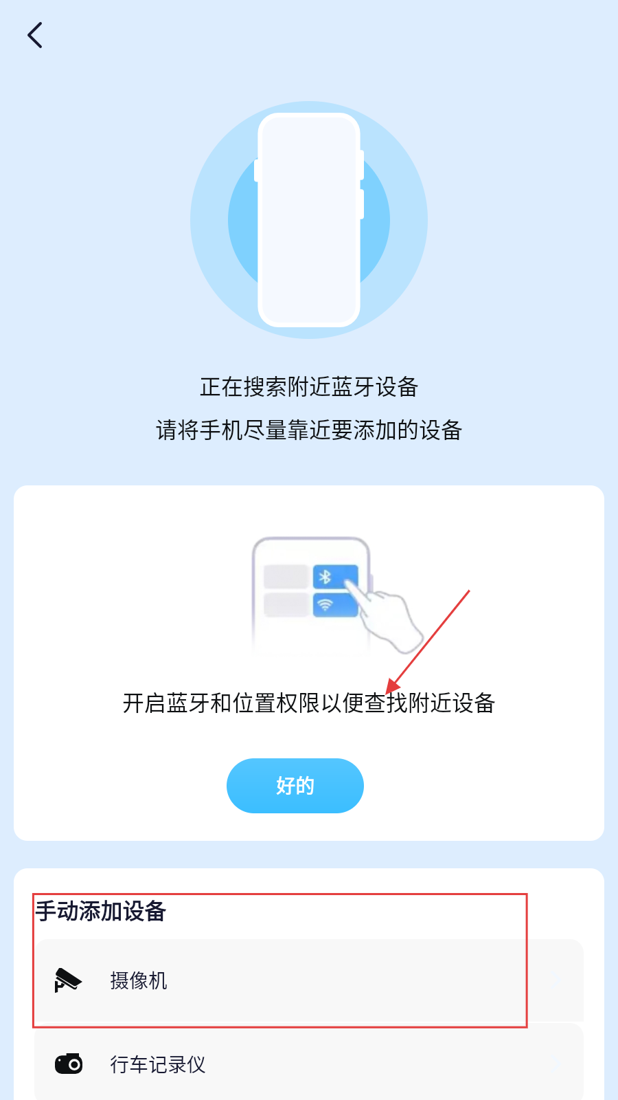 3、选择手动添加时,在权限提示页点击好的,开启蓝牙和位置权限以搜索附近设备,也可直接在手动添加设备区域选择设备类型。