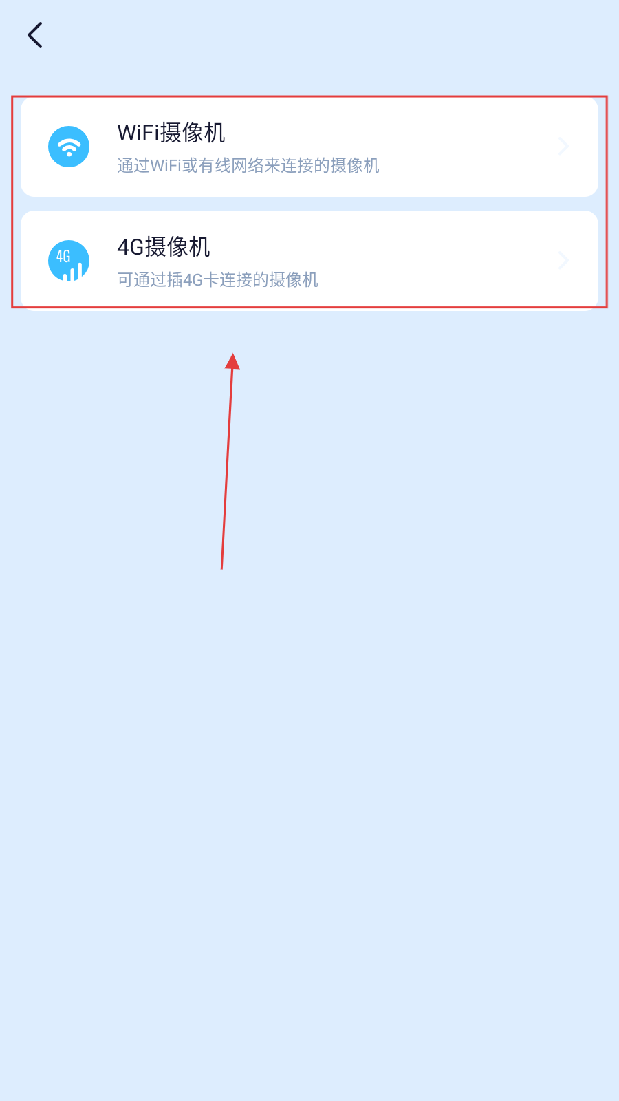 4、进入设备类型选择页面后,选择WiFi摄像机或4G摄像机,连接设备即可。