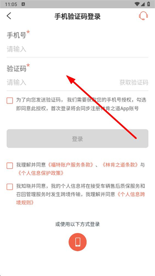 3、在登录页面,勾选协议,填写手机号获取验证码,点击登录按钮,即可完成账号登录操作。