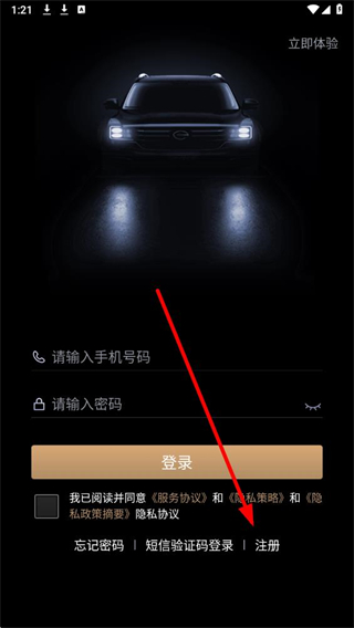 1、在智慧传祺登录界面,点击注册选项,进入手机号注册的信息填写页面。