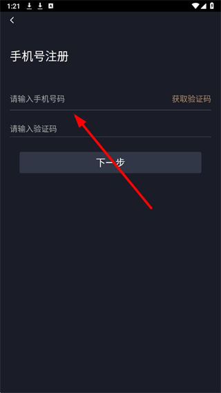 2、在手机号注册页面,输入手机号,点击获取验证码,完成后点击下一步。