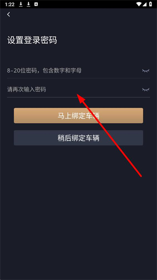 3、在设置登录密码页面,按要求设置密码,选择马上绑定车辆或稍后绑定车辆,完成智慧传祺账号的注册流程。