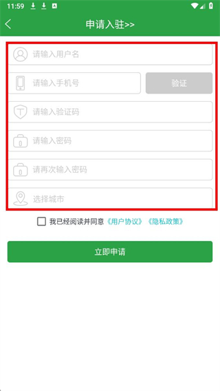 2、在申请入驻页面,依次填写用户名、手机号、验证码、密码等信息,并选择对应城市。