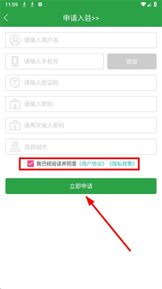 3、勾选同意用户协议,点击页面底部立即申请按钮,提交入驻申请等待审核。