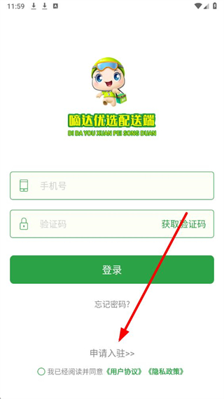 1、在嘀达优选配送端登录界面,点击下方申请入驻选项,进入入驻申请的填写页面。