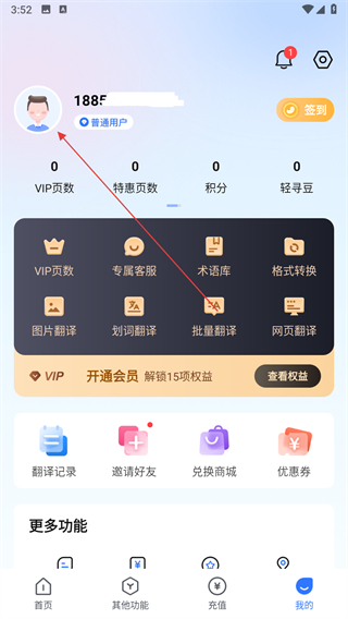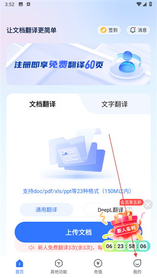 1、打开翻译狗软件,点击界面下方的我的选项,进入个人中心页面。