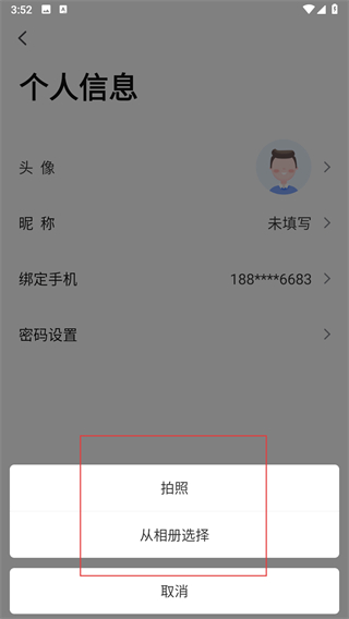 3、在个人信息界面里点击头像选项,弹出拍照和从相册选择的操作菜单。