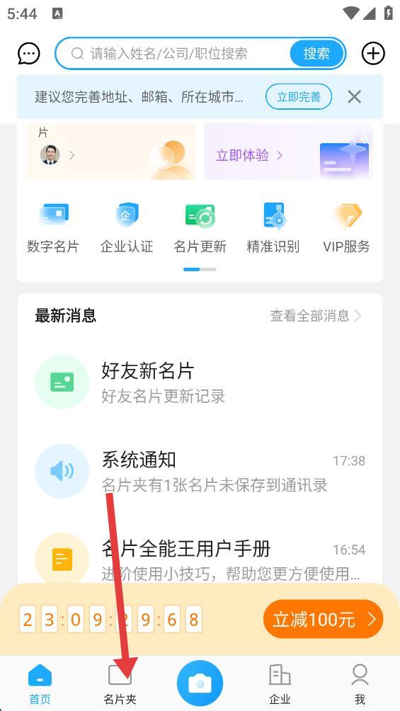 1、打开名片全能王APP,点击底部导航栏中的名片夹选项,进入名片夹页面。