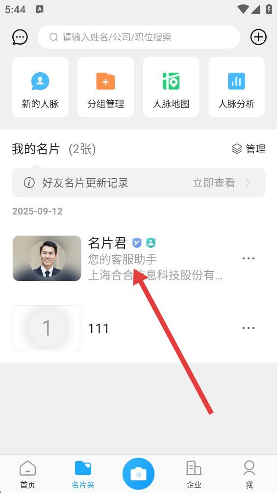 2、在名片夹里找到想要屏蔽的人的名片,点击进入该名片的详情页面。