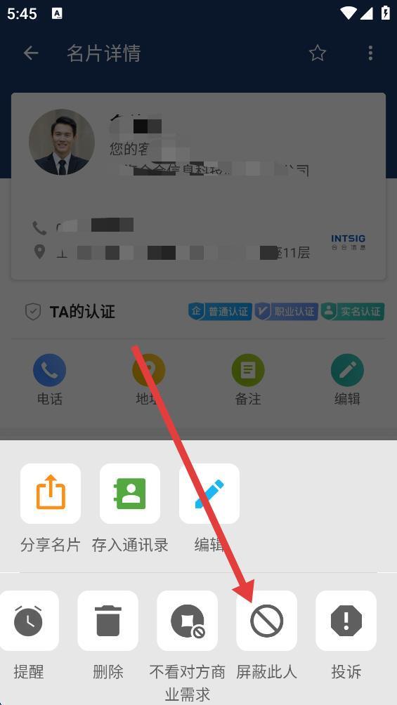 3、在名片详情页面中,点击右上角的三点图标,会弹出一个操作菜单。