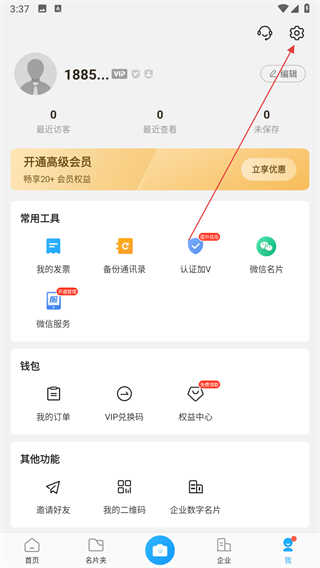 1、打开名片全能王软件,点击界面下方的我选项,进入个人中心页面。