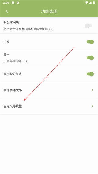 3、在功能设置界面里找到自定义导航栏选项,点击后进入导航栏设置页面。