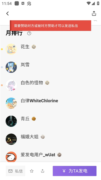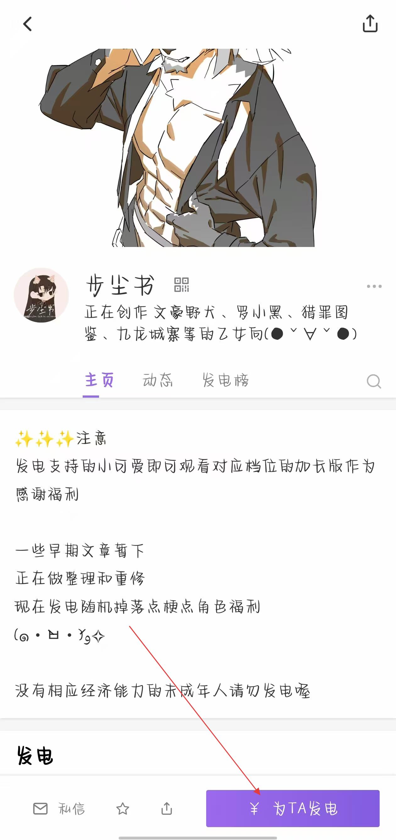 3、在创作者主页底部,点击紫色为TA发电按钮,选择发电档位并完成支付,即可支持创作者并解锁对应福利。