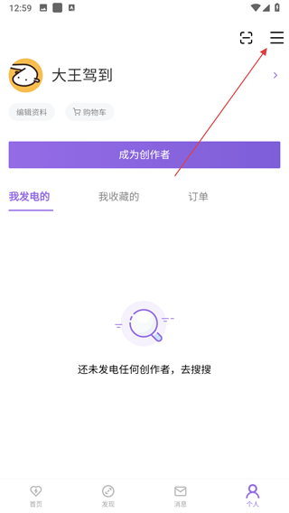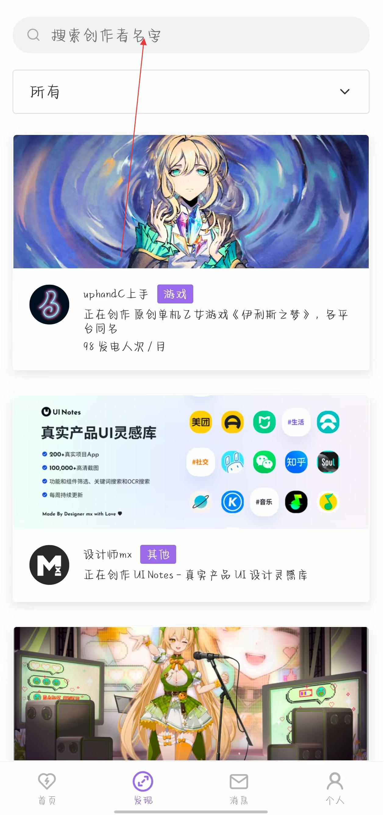 1、打开爱发电应用,在发现页面点击顶部搜索栏,输入创作者名字,触发搜索后浏览结果列表,找到目标创作者。