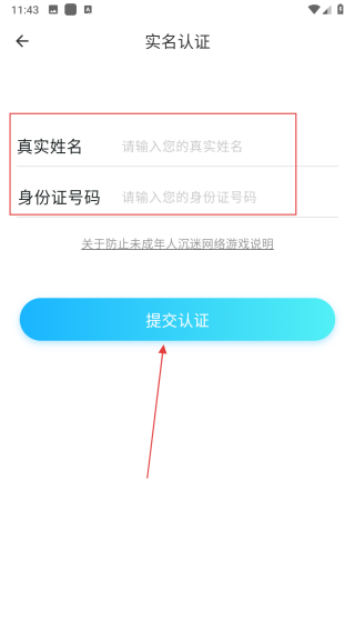 4、在实名认证页面,依次输入真实姓名、身份证号码,输入完成后点击提交认证按钮。
