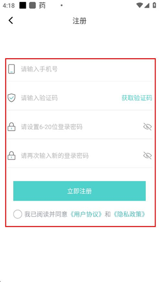 3、在注册页面填写手机号、获取并输入验证码、设置密码,勾选协议后点击立即注册。
