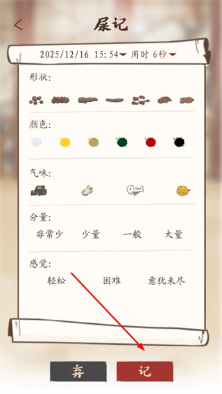 3、在记录页面选择便便的形状、颜色等信息后,点击记,完成本次记录。