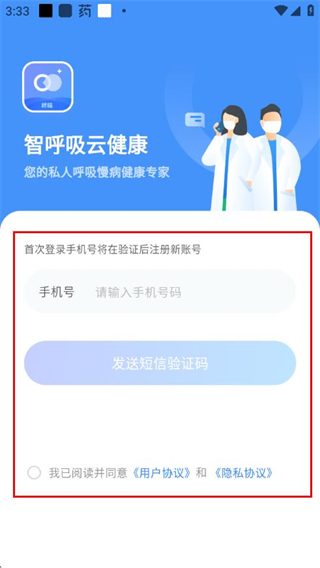 1、打开智呼吸云健康app,在登录页面的手机号输入框填写号码,勾选协议,点击发送短信验证码。