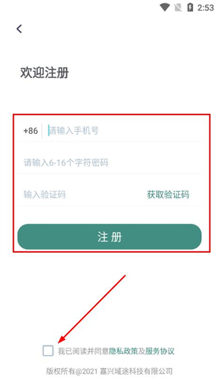 3、填写手机号、设置密码、获取并输入验证码,勾选协议后点击注册。