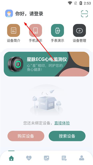 1、打开星脉ECG app首页,点击你好,请登录区域,进入登录页面。