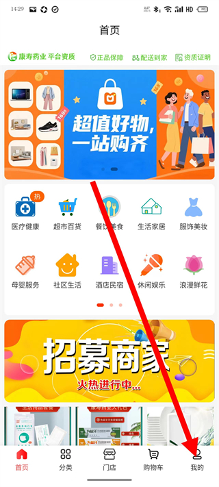 1、打开康寿药业,点击底部我的,进入个人页面。