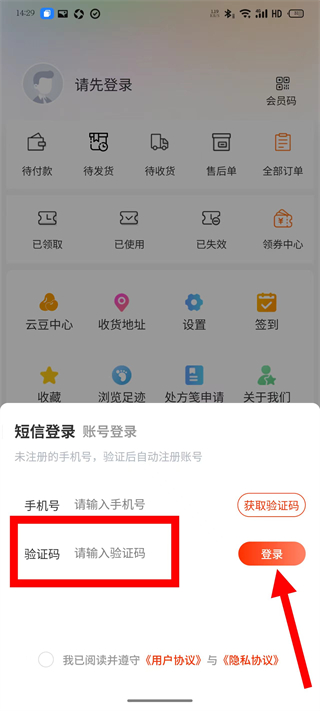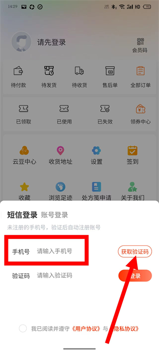 3、在短信登录界面,输入手机号,点击获取验证码。