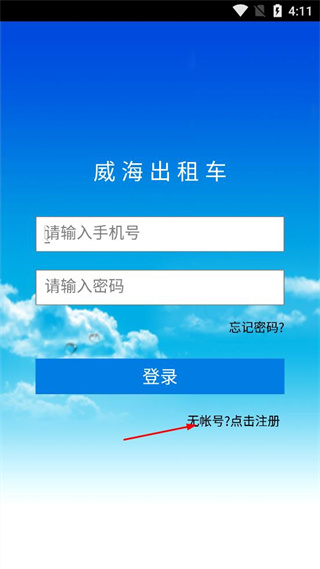 1、进入威海出租车登录界面,若无帐号点击下方无帐号,点击注册选项,进入注册帐号页面。
