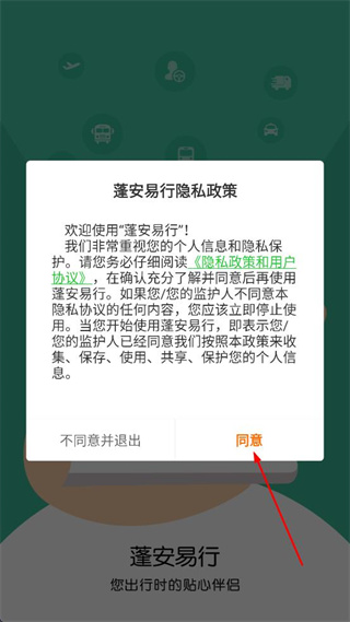 1、查看蓬安易行隐私政策及用户协议,确认内容后点击同意按钮以继续使用该软件。