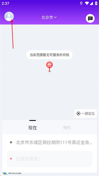 2、进入软件主界面后确认当前定位城市,查看是否有可服务司机,准备输入上下车地点。