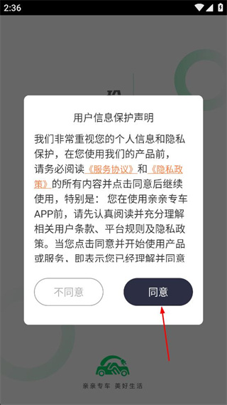 1、阅读用户信息保护声明包含的服务协议和隐私政策,点击同意按钮以继续使用该软件。