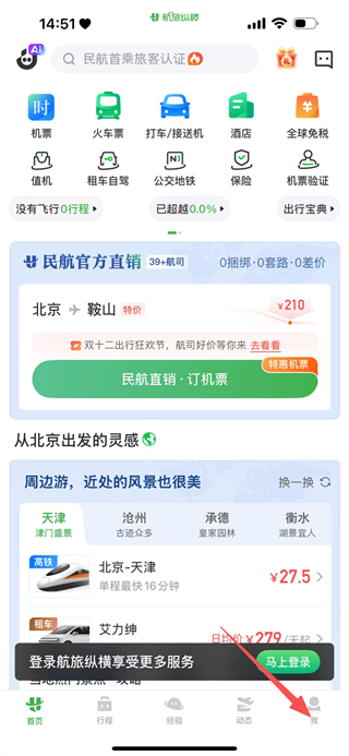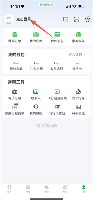 1、在航旅纵横首页,点击底部的我选项,进入个人页面。