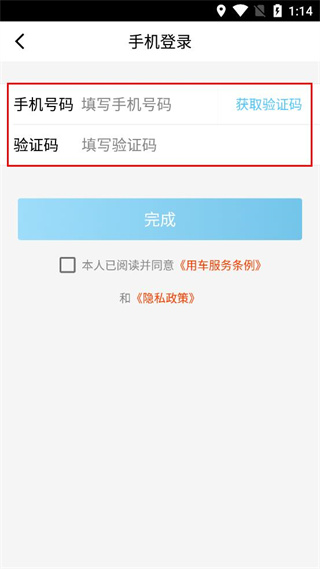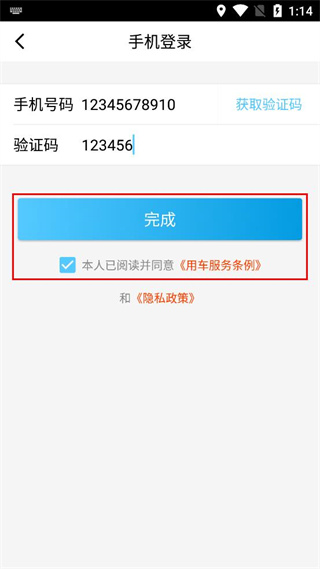 3、勾选同意用车服务条例和隐私政策,点击完成按钮完成账号登录操作。