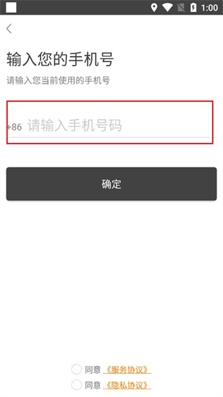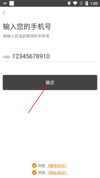 3、勾选页面底部的服务协议和隐私协议,点击确定按钮完成手机号提交。
