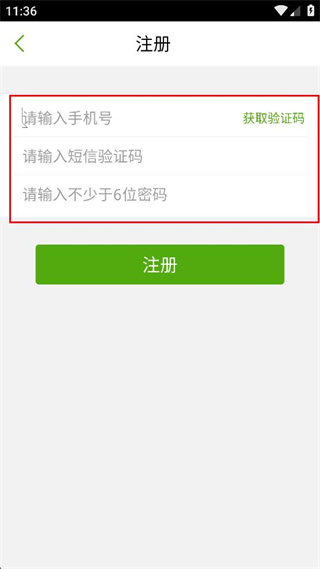 2、在注册界面填写个人手机号,获取并填写对应的短信验证码。