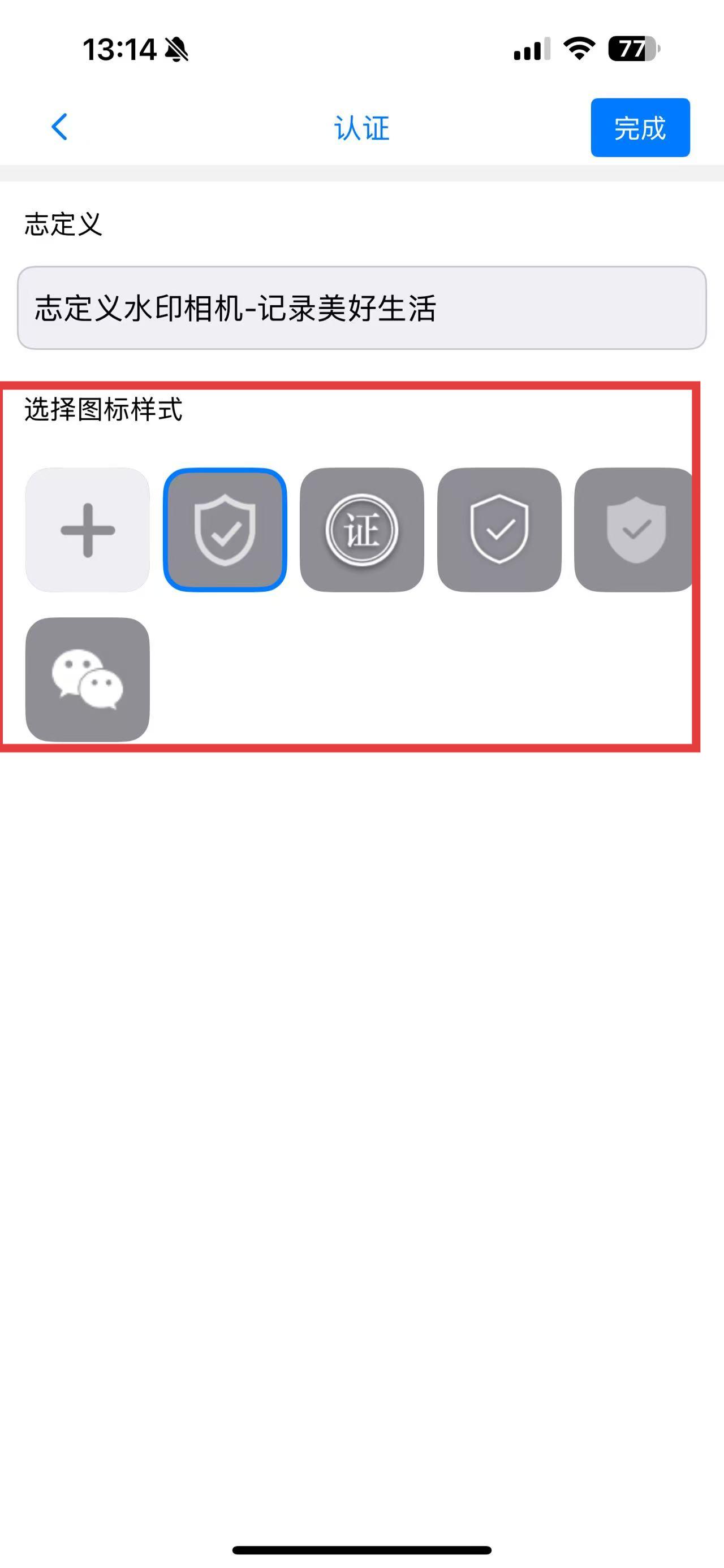 4、输入完成后,还能在选择图标样式区域挑选喜欢的图标样式,最后点击完成按钮,即可修改水印认证信息。