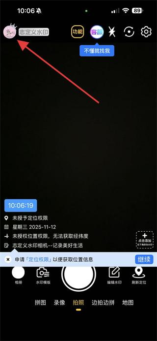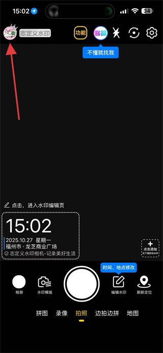 1、打开自定义水印相机APP,点击左上角自定义水印图标,进入个人中心页面。