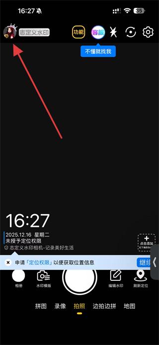 1、打开自定义水印相机应用,点击左上角的头像进入个人中心。