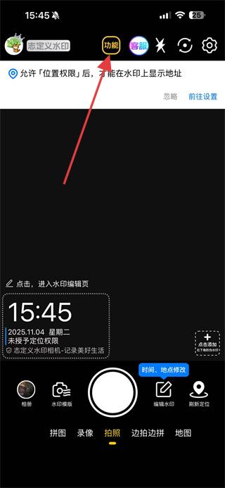 1、打开自定义水印相机APP,点击上方功能按钮,进入功能选择页面。