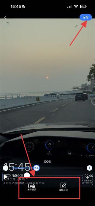 4、视频选择后,可在下方调整水印大小、选择水印模板、编辑水印等,完成后点击右上角保存,即可给视频添加水印。