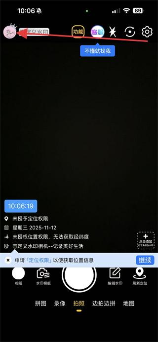 1、打开自定义水印相机应用,点击左上角的头像进入个人中心。