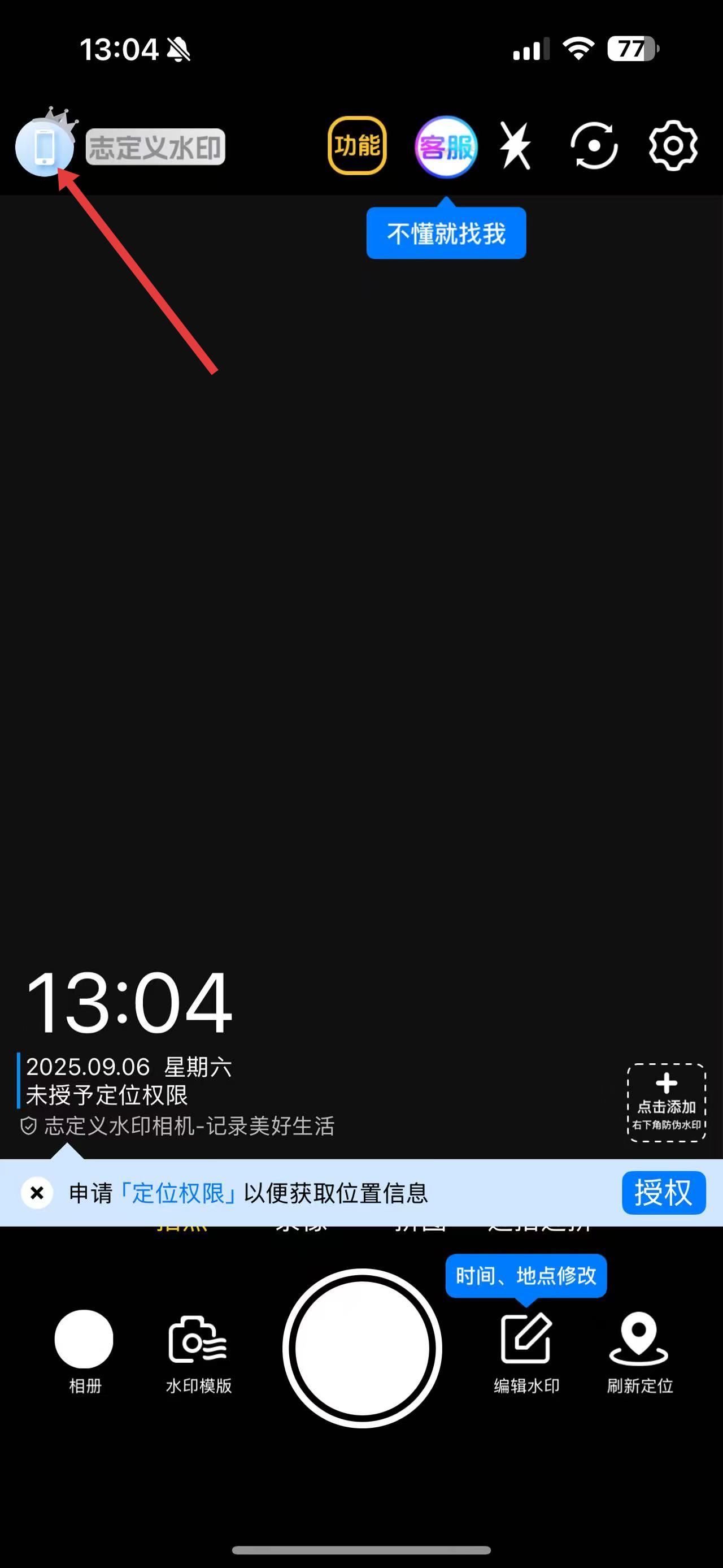 1、打开自定义水印相机应用,点击左上角的头像进入个人中心。