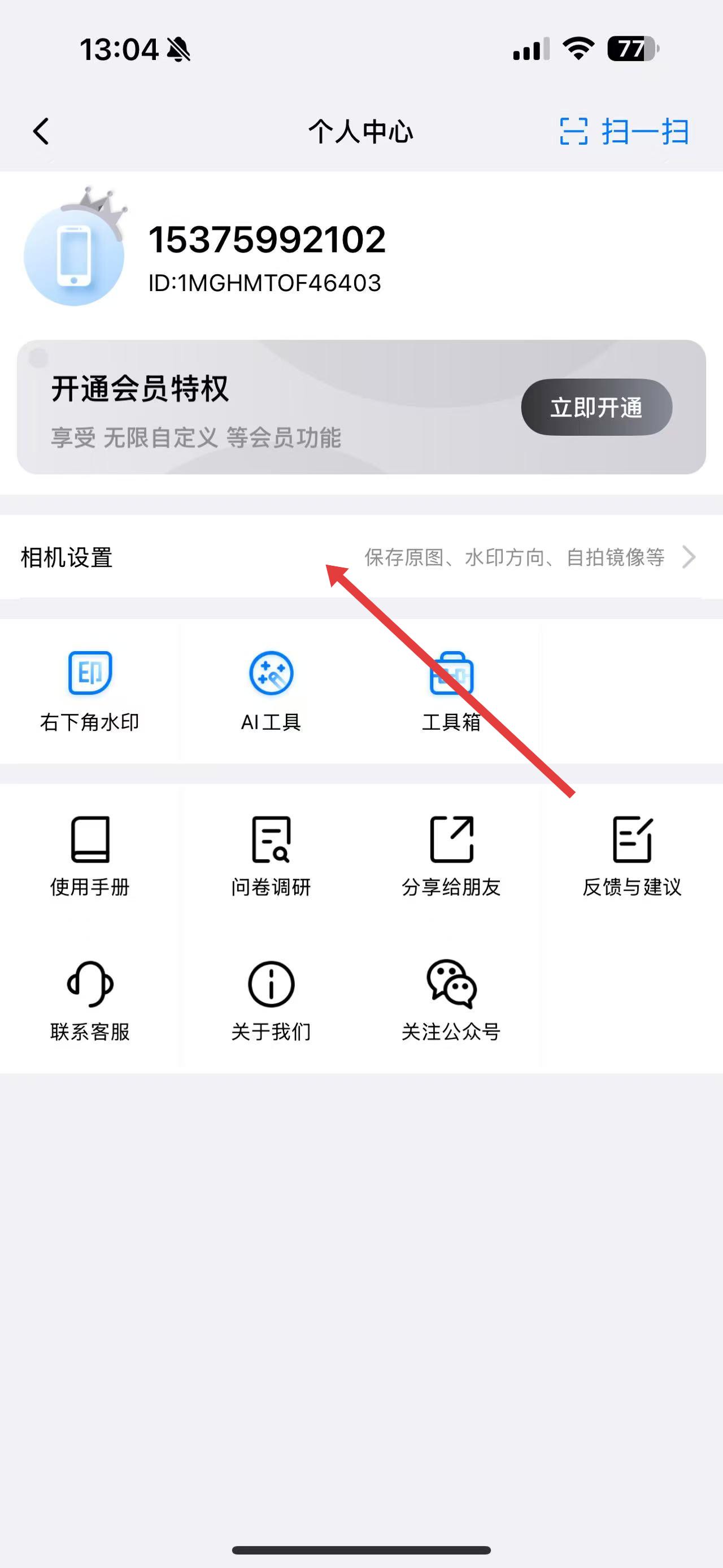 2、在个人中心里,点击相机设置右侧保存原图、水印方向、自拍镜像等文字区域,进入相机设置界面。