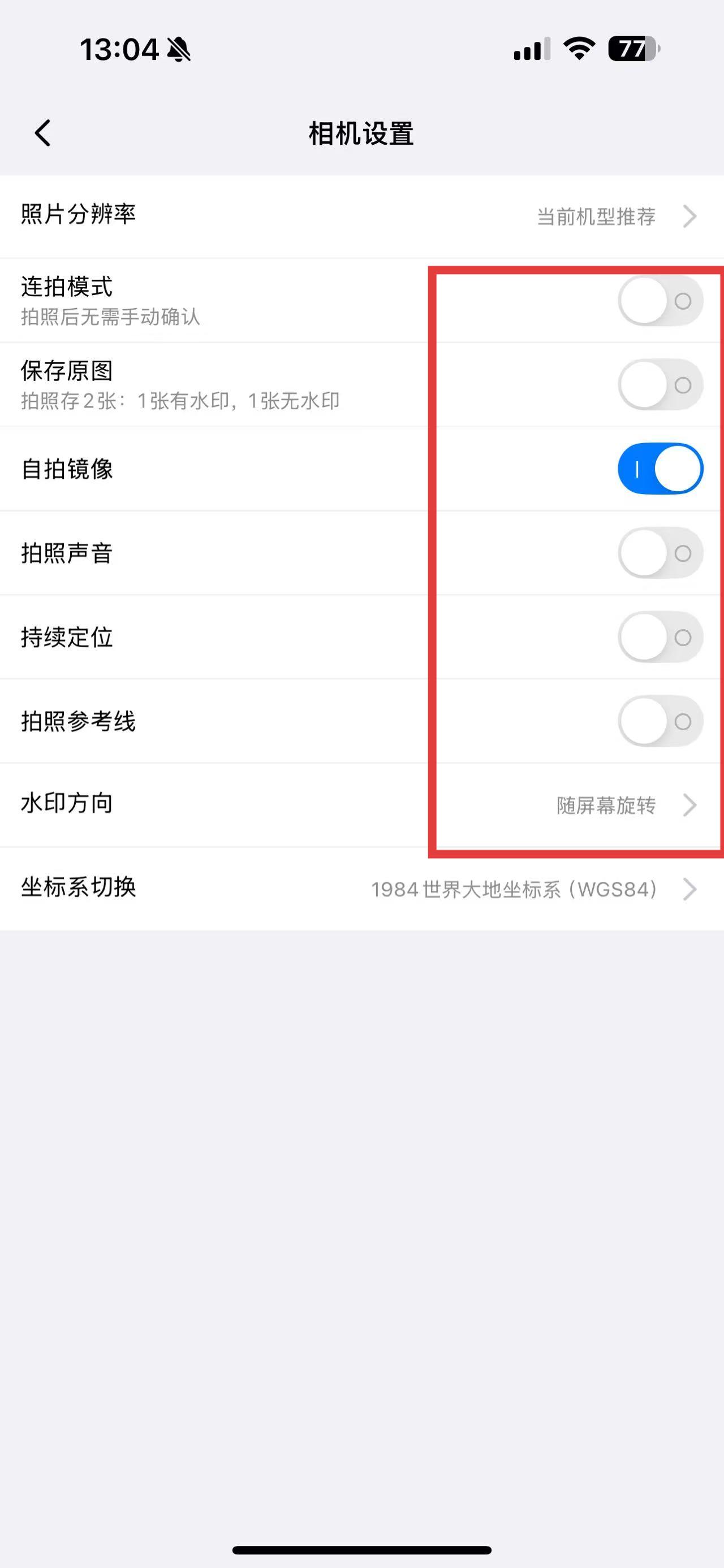 4、在相机设置界面,能对连拍模式、保存原图、自拍镜像、拍照声音、持续定位、拍照参考线、水印方向等进行设置,按需开启或调整。